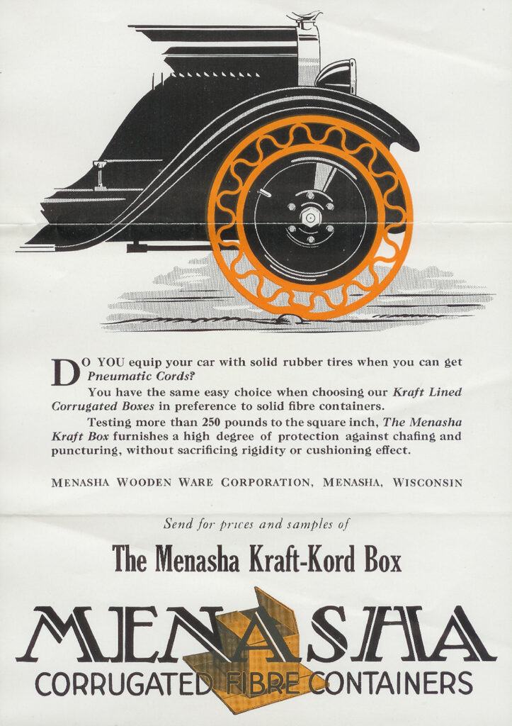En 1927 se toma la audaz decisión de entrar en el negocio de las cajas de cartón corrugado. En lugar de contratar a personas ajenas a la compañía, Menasha da a sus empleados la oportunidad de aprender el nuevo negocio, lo que proporciona empleo estable y oportunidades para los trabajadores. Esta decisión constituye el cambio más ambicioso e importante de la historia de Menasha (pasar de los empaques de madera al cartón corrugado) y redefine el rumbo de la empresa, dando forma a lo que hoy es Menasha Packaging Company.